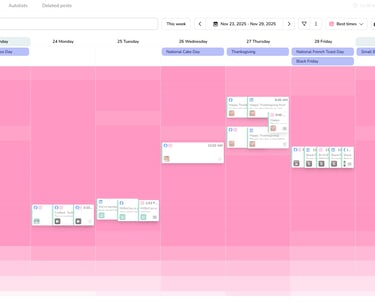 A clean grid where every post gets timed, placed, and queued so your content goes out automatically and on schedule.